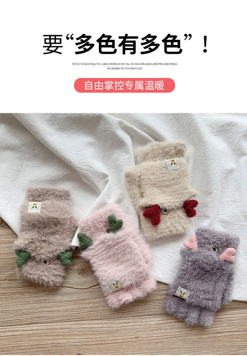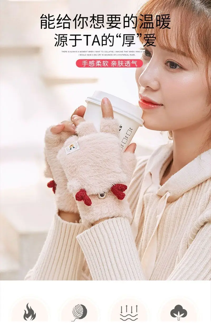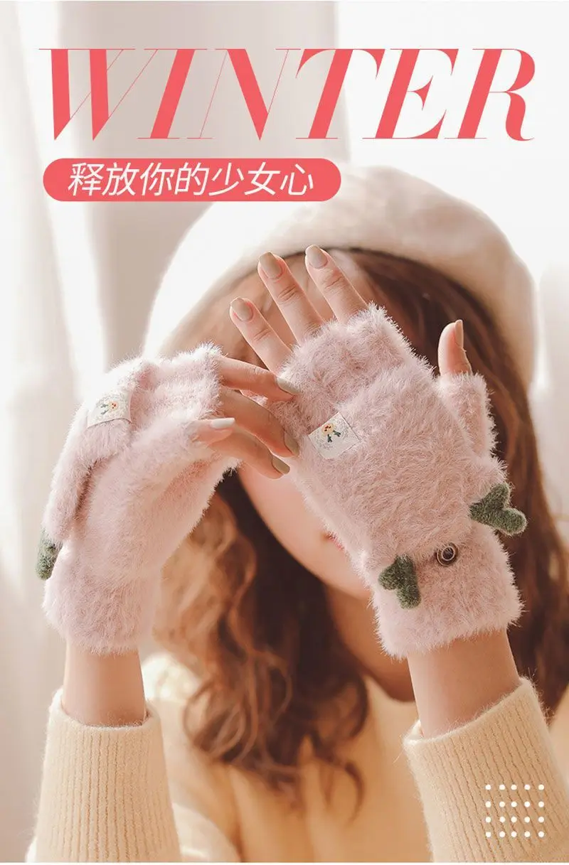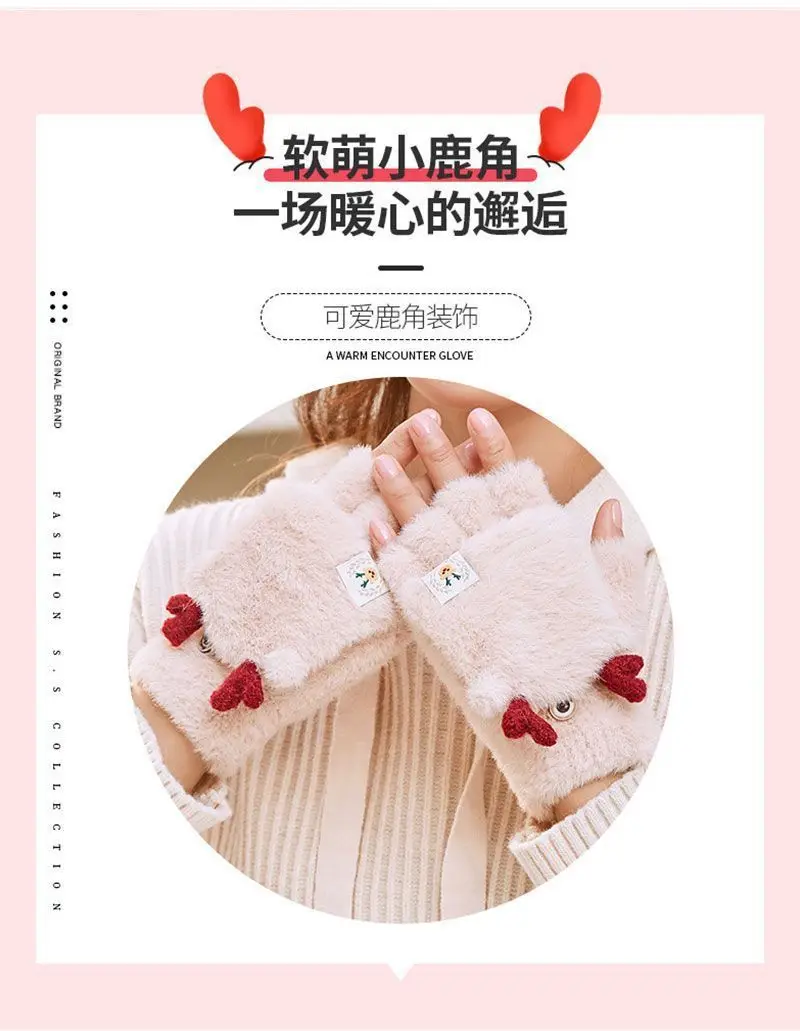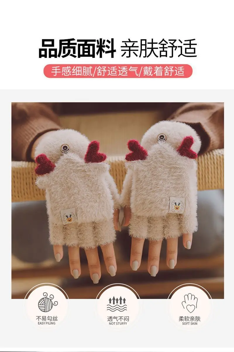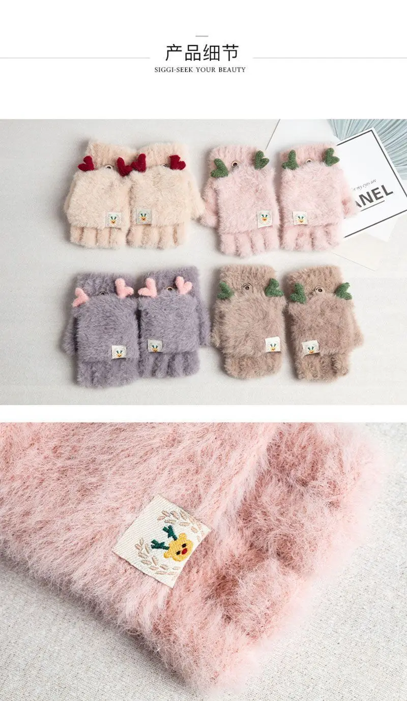 2023 Imitation Mink Cartoon Antlers Knit Mittens Women Flip Half Finger Glove Christmas Gifts Winter Student Write Warm Glove