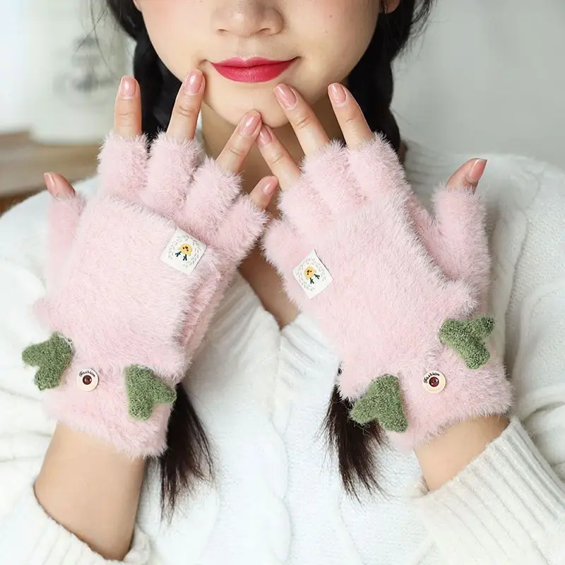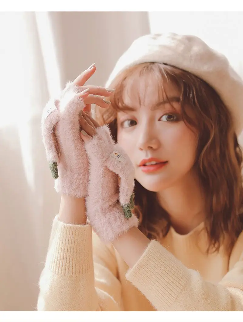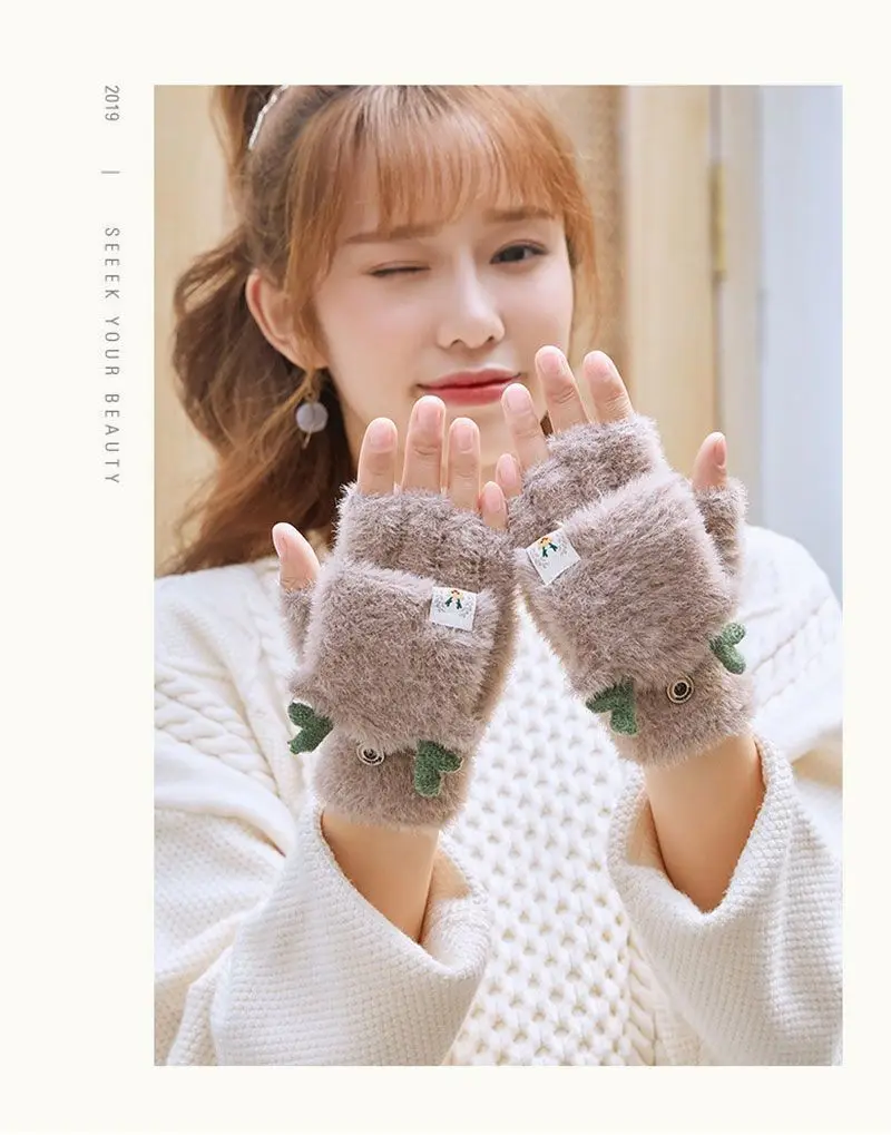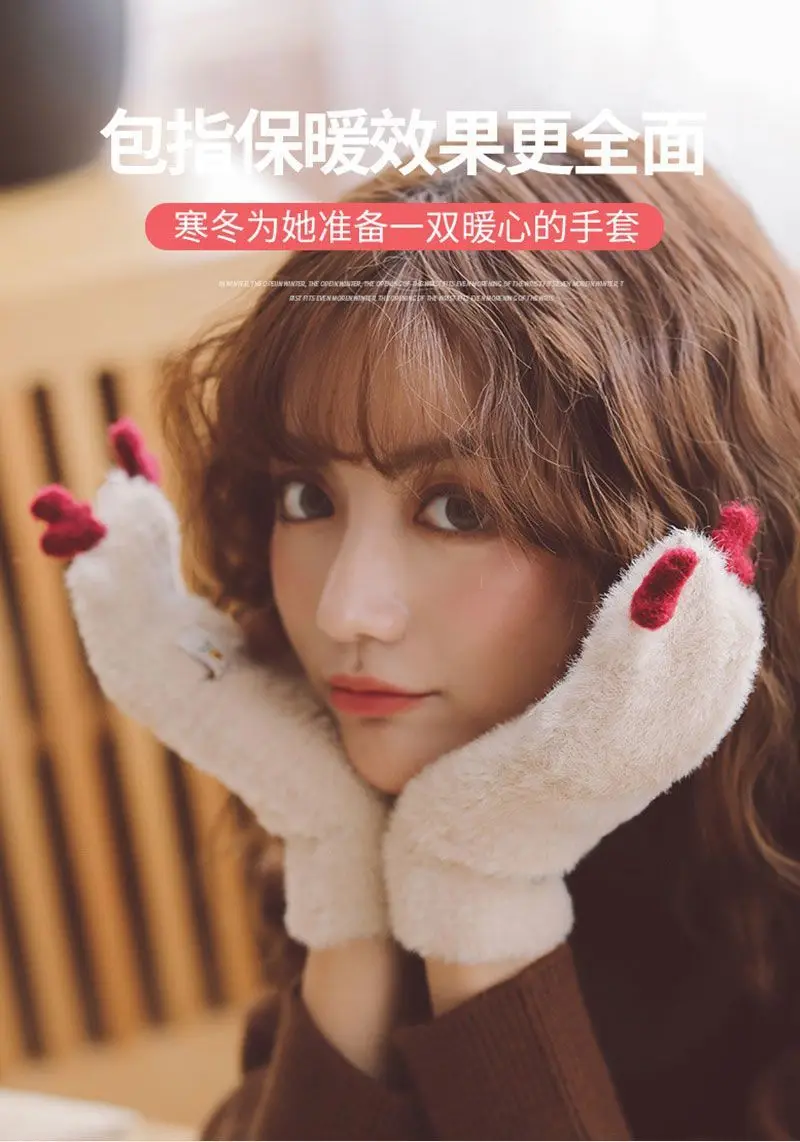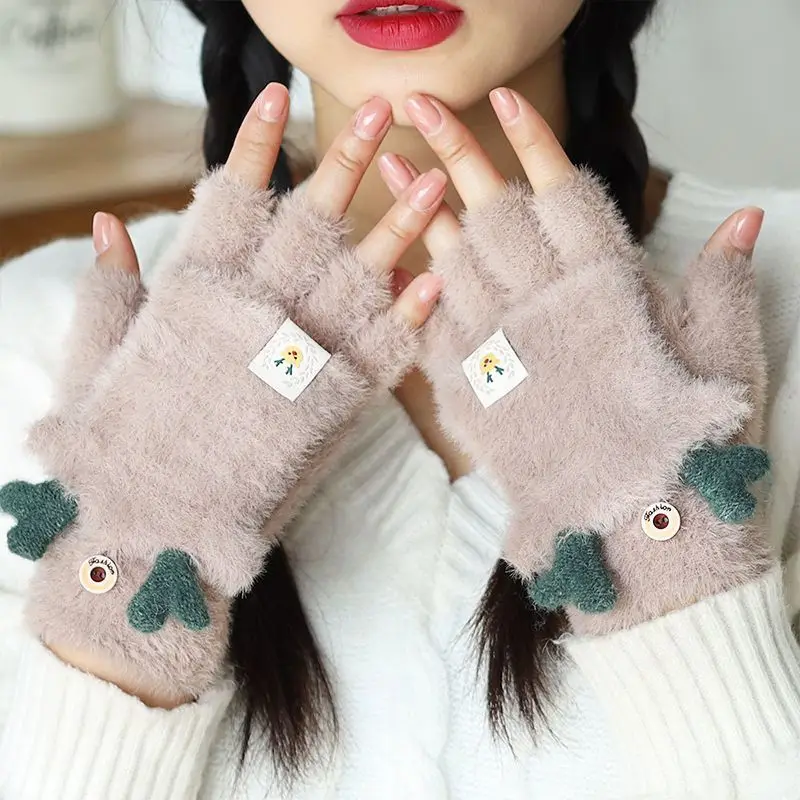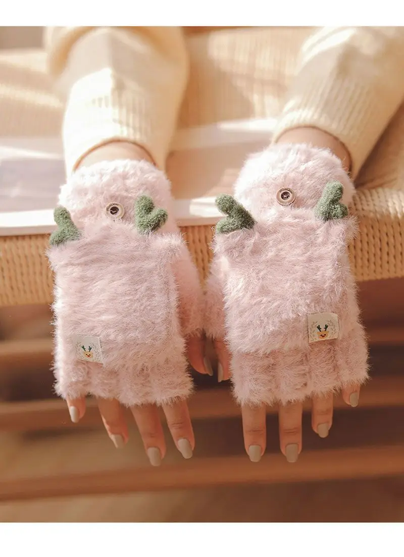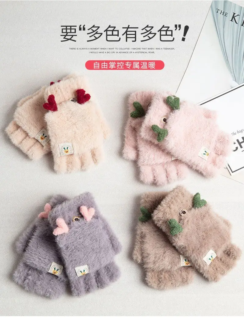 2023 Imitation Mink Cartoon Antlers Knit Mittens Women Flip Half Finger Glove Christmas Gifts Winter Student Write Warm Glove