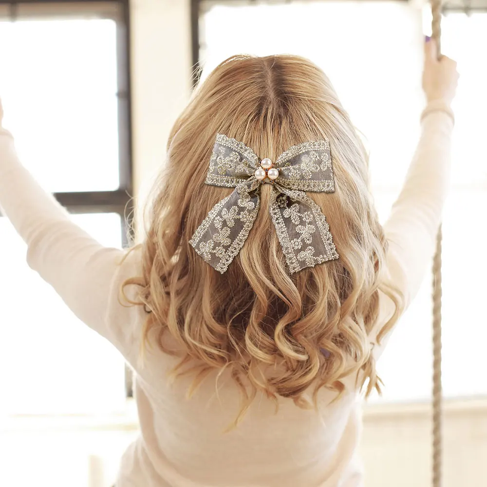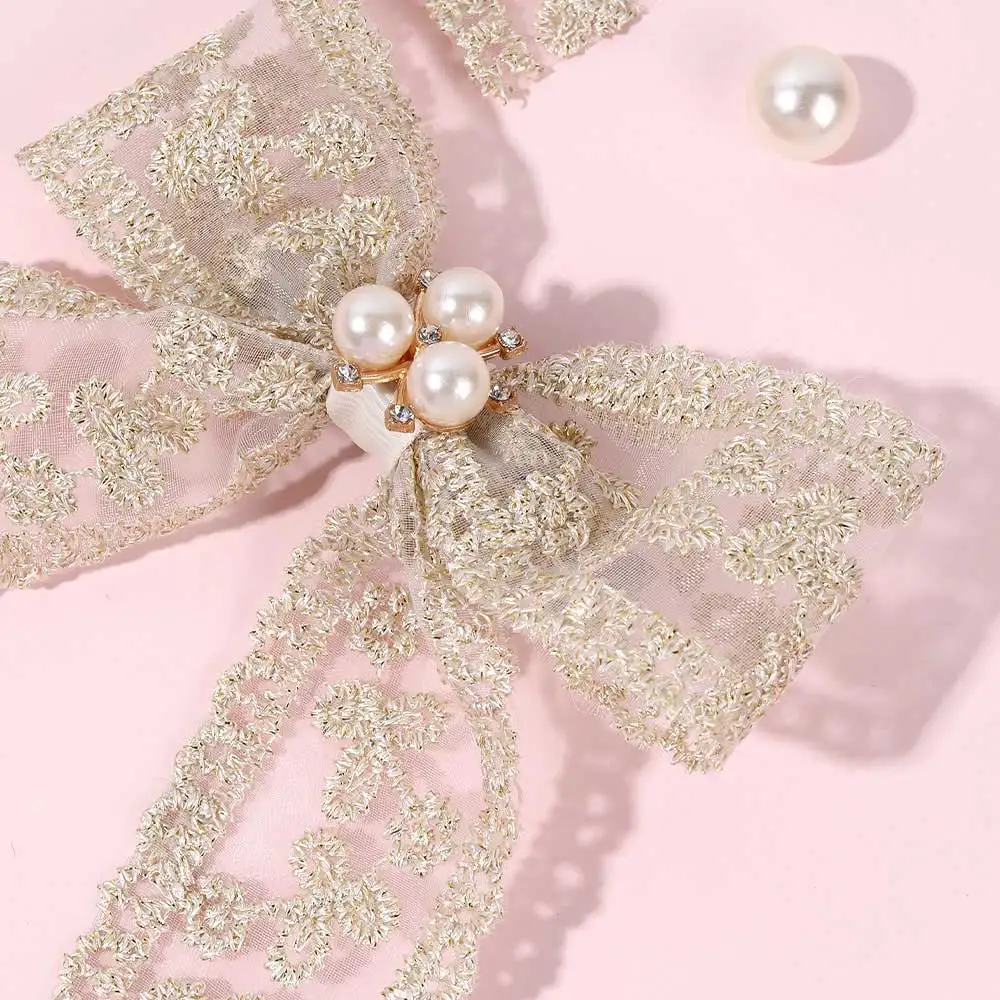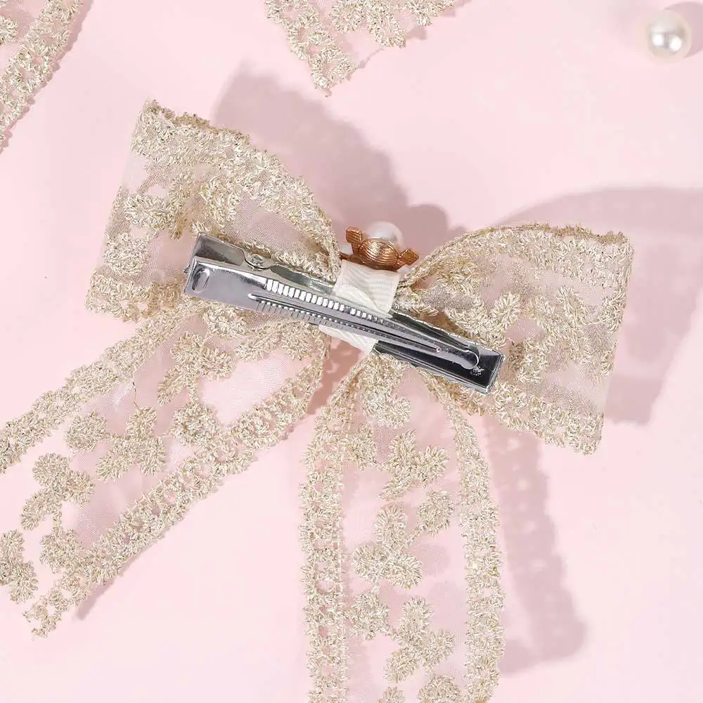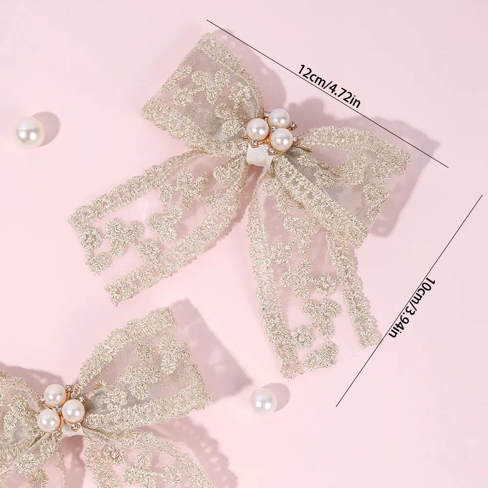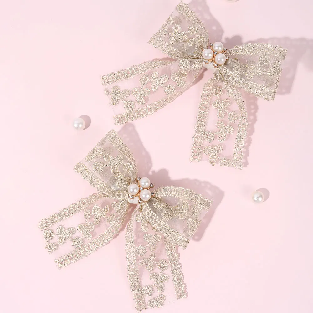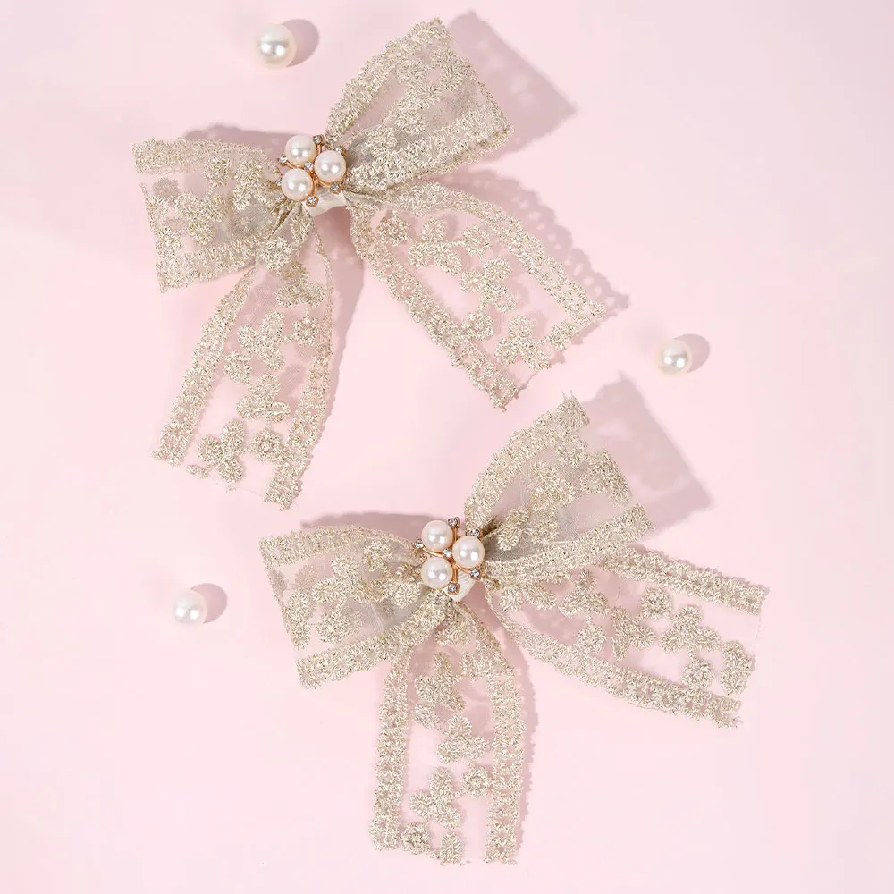 2Pcs Lace Hair Bows And Clips Embroidery Floral Bow Hairpin Sweet Pearl French Barrette Bows Hairgrips Kids Apparel Accessories