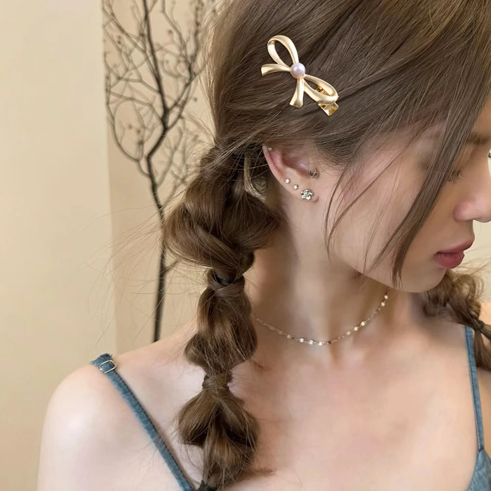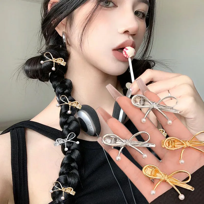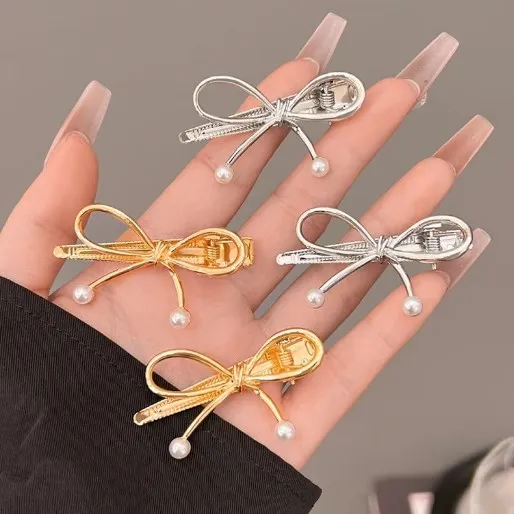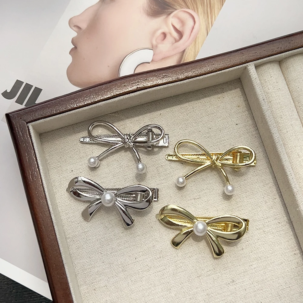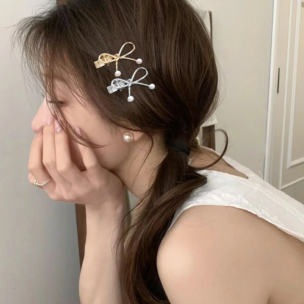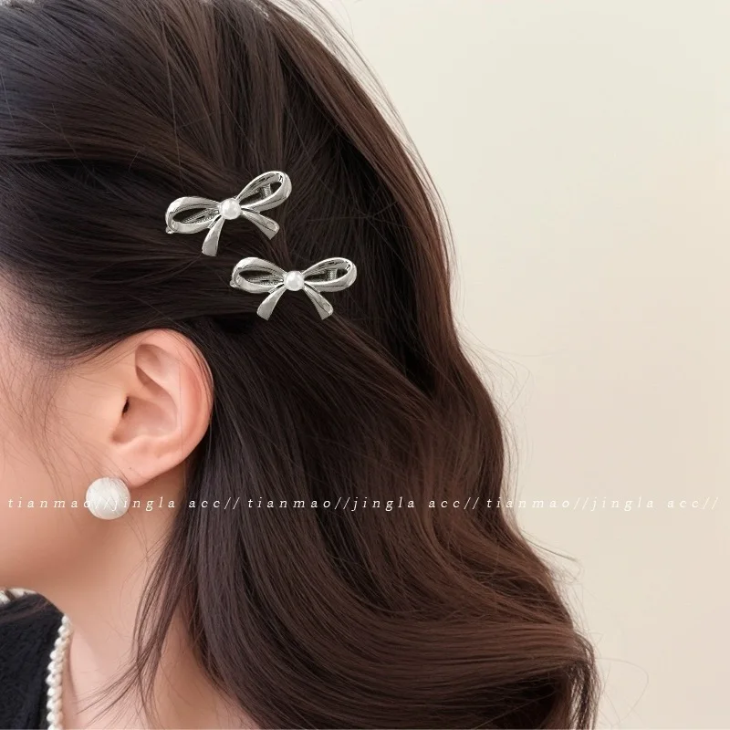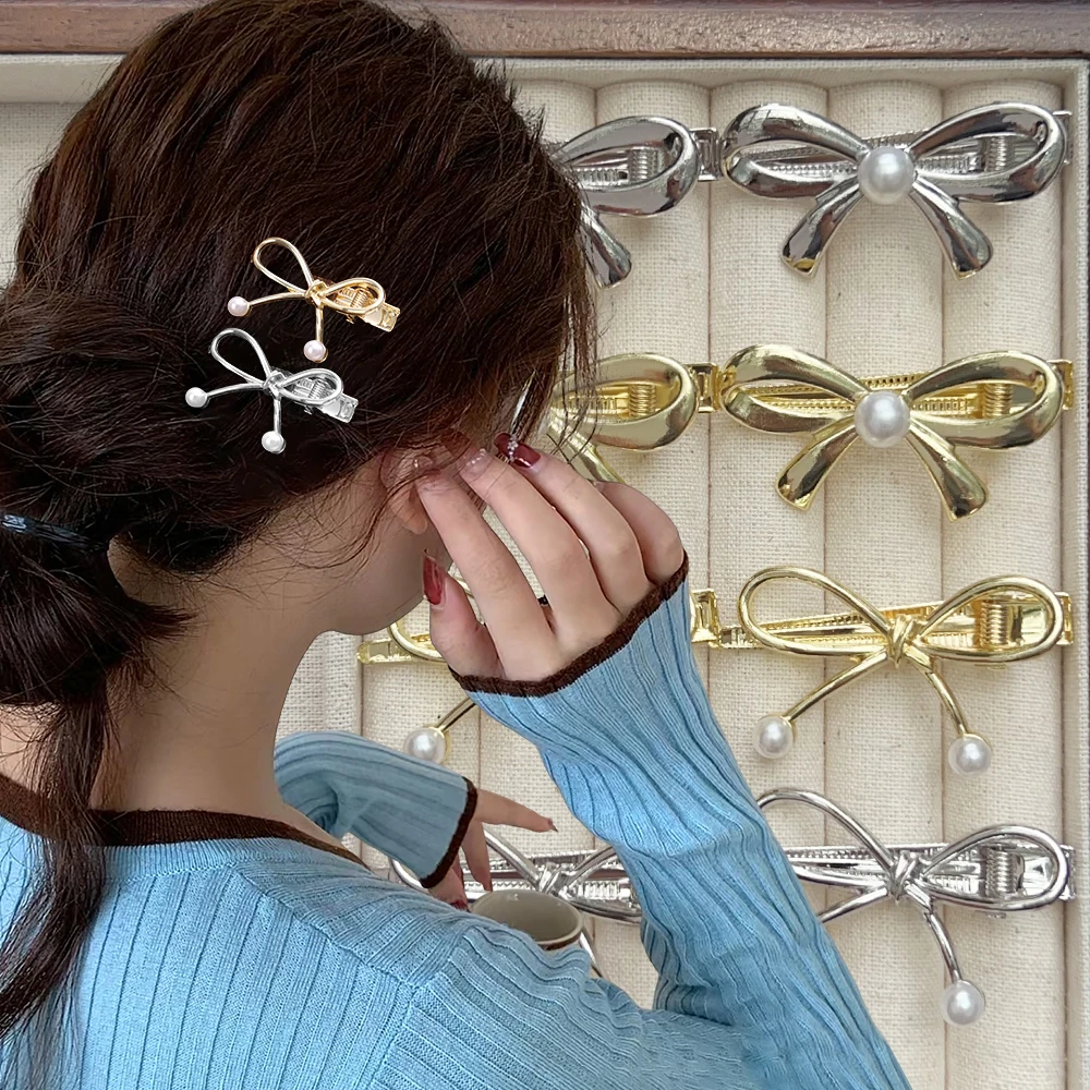 Single Pearl/double Pearl Metal Pearl Bow Hair Clips Sweet Cool Fashion Y2K Zinc Alloy Hairpins New Headwear Apparel Accessories